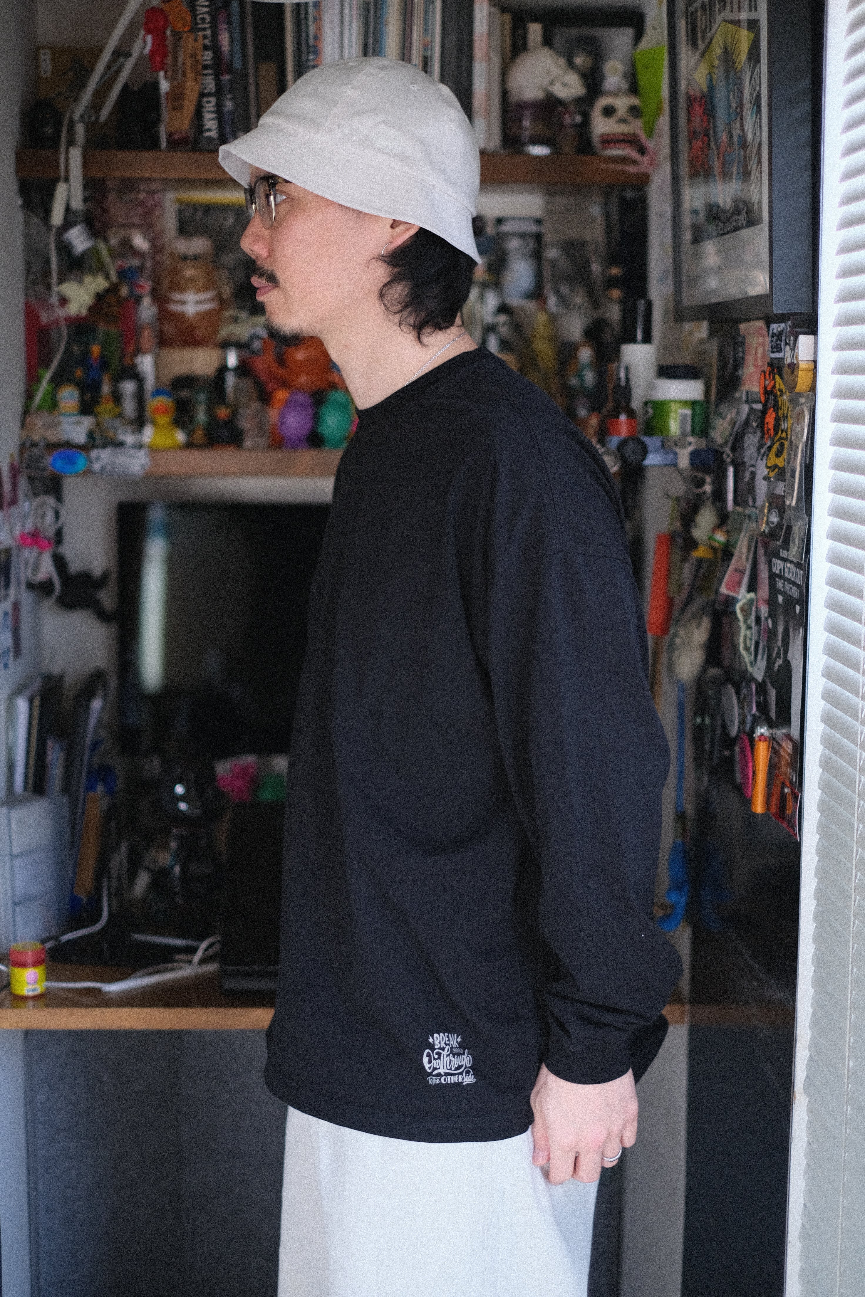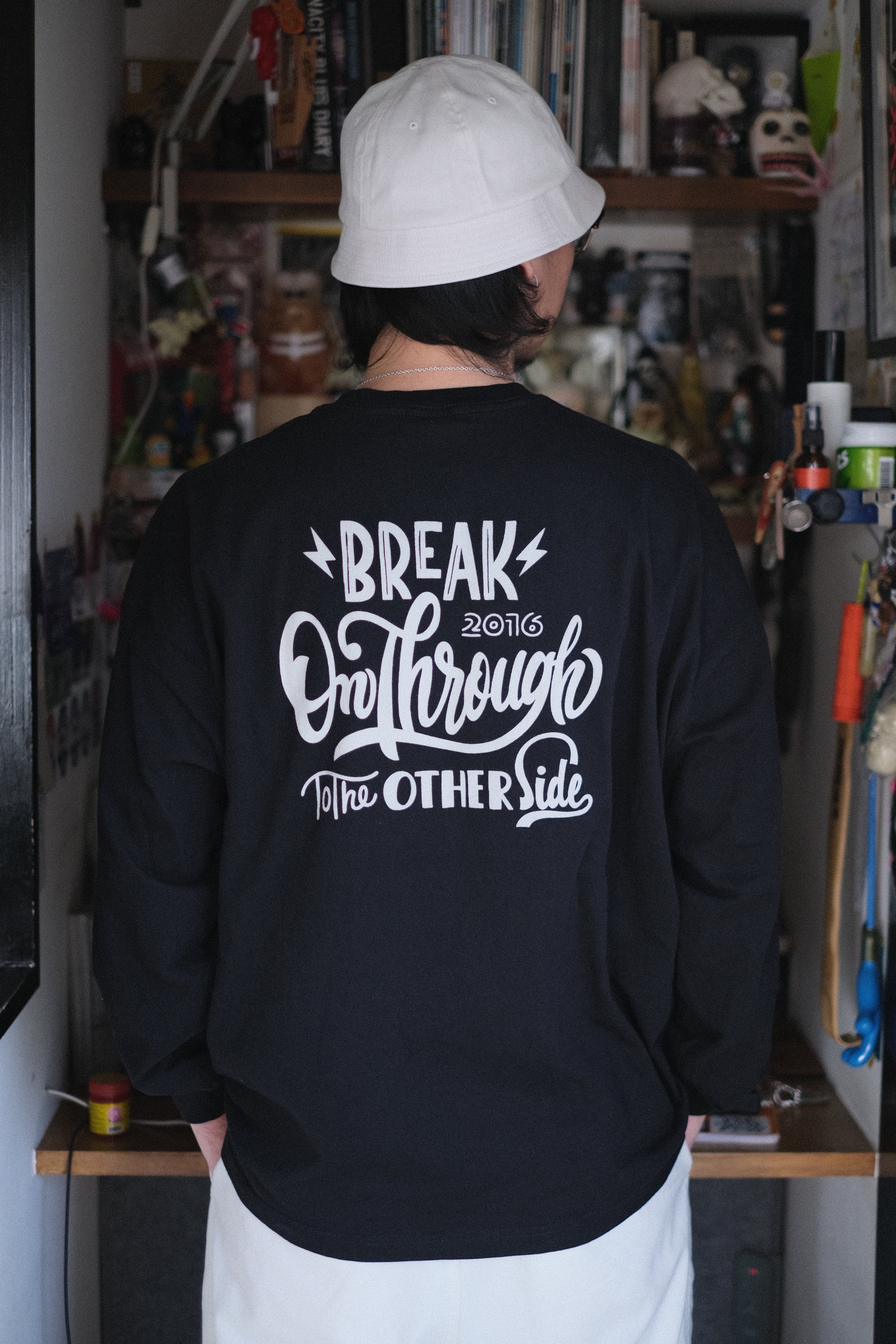 レタリンググラフィックをブリーチプリントにて落とし込んだロンTです。